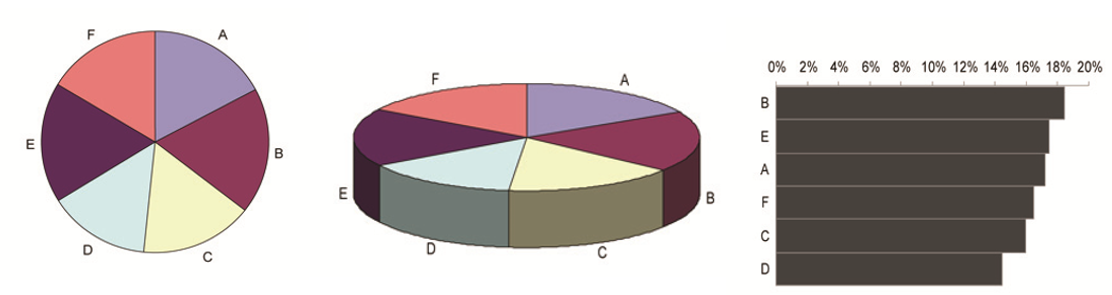 How important is the right visualization? Let's say your goal is to understand which of your company's six products has the most sales. You try breaking down sales via a pie chart. (left two images) As you can see, if the percentages are relatively close, it is very difficult to tell which product comes out on top. So you try putting the products side by side on a bar chart and ordering the bars from highest to lowest. (right image) Bingo! Now, even though the percentages are very similar, you can easily tell which is highest.